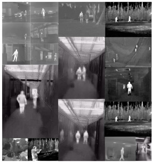 To address these environmental limitations of video exploitation, researchers are exploring alternative sensing technologies and approaches that can complement or enhance DL-based methods []. For example, thermal imaging sensors, such as infrared (IR) cameras, can operate effectively in low-light or no-light environments by detecting the heat signatures emitted by objects, including humans []. IR sensing allows for improved object detection even in complete darkness or challenging weather conditions. Radar [,,] and LiDAR technologies [,,] also play a significant role in various tasks related to object detection. Particularly, the emergence of radar sensors holds great promise for real-time human object detection applications in moving vehicles [,], multimodal systems [,], and passive sensing [,]. In comparison to visible cameras, radar and LiDAR sensors may have limitations in providing detailed texture information about the viewing scene. Consequently, the lack of texture information makes it challenging to utilize radar and LiDAR effectively for tasks such as human object detection and recognition.