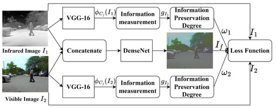 Image fusion has been an active field [,], and many algorithms have been developed. DL-based image fusion techniques are of particular interest to MEIRFS due to their superior performance and reduced efforts for feature engineering and fusion rules. Zhang et al. [] provide a comprehensive review of the DL methods in different image fusion scenarios. In particular, DL for infrared and visible image fusion can be categorized into autoencoder (AE), convolutional neural network (CNN), and generative adversarial network (GAN)-based methods according to the deep neural network architecture. Since AE is mostly used for feature extraction and image reconstruction while GAN is often unstable and difficult to train, we consider CNN-based methods to facilitate the multi-object tracking task. To overcome the problem of lacking a universal groundtruth and no-reference metric, CNN-based fusion constrains the similarity between the fusion image and source images by designing loss functions. Specifically, we adapt U2Fusion [] for the MEIRFS system, which provides a unified framework for multi-modal, multi-exposure, and multi-focal fusion. However, U2Fusion [] did not consider image registration, which is the first step towards image fusion. Due to the differences in camera parameters such as the focal length and field of view, the images may not share the same coordinate system, and thus image registration is necessary to align and fuse the images. We calibrate the IR and visible cameras and compute the transformation matrix offline to reduce the online effort for image registration. The image registration in our work is performed by cropping the RGB image to align the FOV with the IR image based on the camera calibration for our hardware design and achieves efficacy performance. It is noted that integrating image registration into the U2Fusion model and training the integrated model in an end-to-end manner can simplify the image registration process and improve image fusion performance [], which will be investigated in future work. After image registration, the training pipeline of U2Fusion with aligned images is shown in Figure 8.