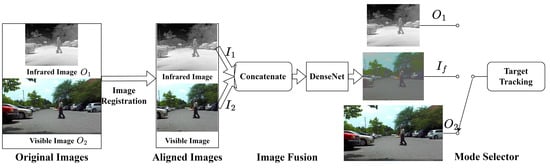 To train a customized model for our system, we can fine-tune the learned model in U2Fusion using transfer learning approaches [] with data collected by the cameras to enhance learning efficiency. Furthermore, since solely IR or visible images can be sufficient for the object tracking task under certain environmental conditions, we designed a selector switch to skip the image fusion if it is unnecessary to detect the object. The mode selector is controlled manually, i.e., the operator selects the proper mode based on the assessment of the image quality of the infrared and visible images and the necessity of image fusion. In future work, we will incorporate mode selection into the U2Fusion model to automatically select the mode. Figure 9 shows the complete pipeline of image fusion processing for object tracking.