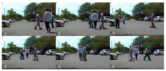The tracking model employed has undergone pre-training on two datasets, namely CrowdHuman [] and MOT20 []. The CrowdHuman dataset is characterized by its extensive size, rich annotations, and substantial diversity. The CrowdHuman dataset encompasses a total of 470,000 human instances from both the training and validation subsets. Notably, each image within the dataset contains an average of 22.6 people, thereby exhibiting a wide range of occlusions. On the other hand, the MOT20 dataset comprises eight sequences extracted from three densely populated scenes, where the number of individuals per frame can reach up to 246 individuals. The pre-trained model’s exposure to such varied and challenging conditions enables it to effectively handle a wide array of real-world scenarios, leading to enhanced object tracking capabilities and more reliable results. The original model used in our research was trained on a separate system consisting of eight NVIDIA Tesla V100 GPUs with a batch size of 48. There is a 80epoch training schedule for the MOT17 dataset, combining the MOT17, CrowdHuman, Cityperson, and ETHZ datasets. The image size is set to 1440 × 800, with the shortest side ranging from 576 to 1024 during multi-scale training. Data augmentation includes Mosaics and Mixups. The optimizer is SGD with a weight decay of 5 × 10−4 and momentum of 0.9. The initial learning rate is 10−3 with a 1epoch warm-up and cosine annealing schedule. For the inference stage, we performed the evaluations on an NVIDIA 2080 Ti GPU. With this configuration, we achieved 27.98 frames per second (FPS), which demonstrates the real-time capabilities of our hardware system.