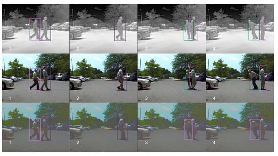 Figure 12 illustrates the performance of the MEIRFS tracking algorithm on images captured by an IR camera, images captured by a visible camera, and the fused images obtained by sensor fusion. Analysis of the top and middle rows reveals that both scenarios encounter challenges in tracking person #1, and person #2 is incorrectly assigned as person #1, while person #1 is mistakenly considered a new individual, person #3. However, in the bottom row, following the fusion of IR and visible images, our tracking algorithm successfully tracks both person #1 and person #2, even in the presence of occlusions. The performance highlights the effectiveness of the induced sensor fusion, which combines information from both IR and visible images. As a result, the fusion process enriches the image features available for utilization by the tracking algorithm, leading to improved tracking performance in challenging scenarios.