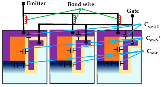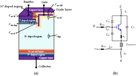 In Equation (1), Cge, Cgc, Cce is the equivalent capacitance of the IGBT, Cox-GE represents the oxide layer capacitance between terminal G and terminal E, Cox-N+ represents the oxide layer capacitance between terminal G and highly doped N-type semiconductors, Cox-N− represents the oxide layer capacitance between terminal G and low-doped N-type semiconductors, Cox-P represents the oxide layer capacitance between terminal G and P-type semiconductor, Cdep represents the depletion region capacitance in the N-type drift region, Cch-dep represents the depletion region capacitance of the channel and Cp + n represents the junction capacitance.