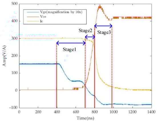 As shown in Figure 2, the duration of the first stage starts from the decline of the driving voltage Vge to the point where the collector current Ic begins to decrease. As the collector current Ic starts to decrease, the collector–emitter voltage Vce rapidly rises. The duration of the second stage starts from the point where the collector current Ic begins to decrease and continues until the collector–emitter voltage Vce rises to the DC bus voltage. The duration of the third stage starts from the point where the collector–emitter voltage Vce rises to the DC bus voltage and continues until the collector current Ic decreases to its initial value of 10%, indicating the disappearance of the voltage generated by the parasitic inductance in the collector–emitter circuit.