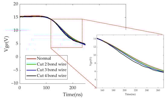 The duration of stage 1 of the turn-off process is reflected by the decrease in gate voltage Vge. Therefore, by comparing the gate voltage change during the turn-off process of the IGBT under different wire bond fatigue levels, the relationship can be obtained, as shown in Figure 5.