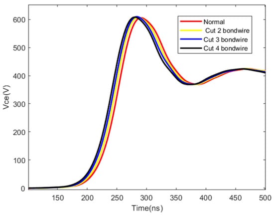 Similarly, the duration of stage 2 of the turn-off process is reflected by the rise time of the collector–emitter voltage Vce. Therefore, by comparing the voltage rise process during the turn-off process of the IGBT under different bond wire fatigue levels, the relationship can be obtained, as shown in Figure 6.