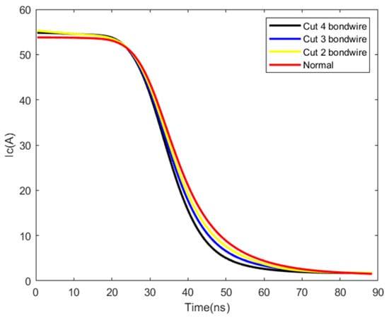 Similarly, the duration of stage 3 of the turn-off process is reflected by the decrease in collector current Ic during the turn-off process. Thus, by comparing the change in the collector current during the turn-off process of the IGBT under different bond wire fatigue levels, the relationship can be obtained, as shown in Figure 7.