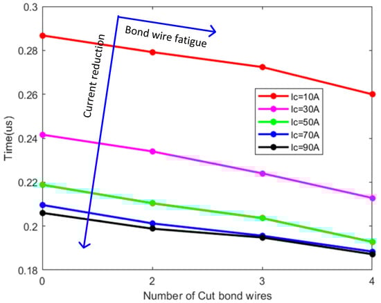 According to the derivation of Equations (1), (2) and (5), it can be concluded that the level of bond wire fatigue is inversely proportional to the duration of stage 3 of the turn-off process. The decreased time for the collector current in Figure 7 demonstrates the correctness of this theory very well.