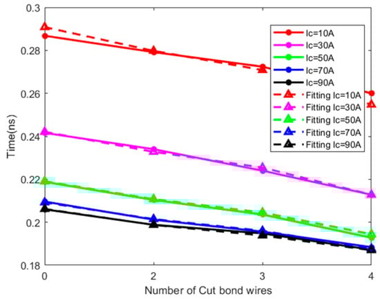 where X represents the number of cut bond wires. Based on the fitting results of the above data, summarizing the parameters corresponding to the fitting equation can result in a more general bond wire fatigue model based on turn-off time, considering the collector current, as shown in Equation (7).