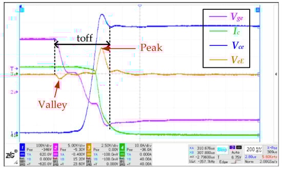 Figure 10 shows the change in VeE between the Kelvin terminal e and the Emitter terminal E in Figure 1b during the turn-off process. The VeE waveform at peak point is caused by the external discharge of the gate capacitor Cge and Miller capacitor Cgc during the turn-off process. This results in a change in the gate current and the generation of voltage due to the inductance on the gate circuit. The VeE waveform at valley point is caused by the change in collector current during the turn-off process, which generates voltage on the bond wire inductance. Thus, the duration of the entire IGBT turn-off process can be represented by the time interval between the peak and valley points of the VeE waveform. This also provides favorable conditions for the subsequent online monitoring of IGBT turn-off time in power electronic converters.