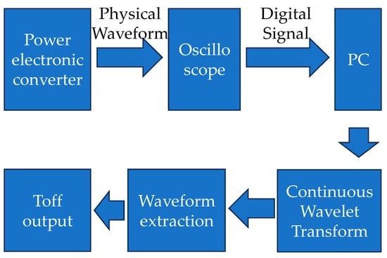 In this section, the triggering and communication functions of an oscilloscope are utilized to acquire IGBT turn-off waveform data in real-time during the operation of a power electronic converter. The online and real-time monitoring of the IGBT module turn-off time is achieved through continuous wavelet transform of the acquired waveform data. The implementation principle of the online monitoring of turn-off time is shown in Figure 11.