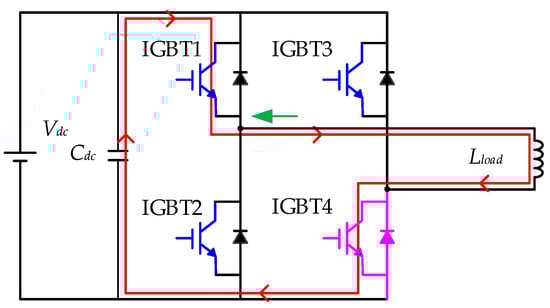 Hence, the commutation path of the single-phase inverter that is suitable for online monitoring of the turn-off process of IGBT4. The green arrow in Figure 13 indicates the positive direction of the current probe and the red lines represent one of the commutation paths of the inverter. Therefore, by monitoring the switching status of IGBT4 during the negative half-cycle of the load current in the single-phase inverter, online monitoring of the turn-off time of IGBT4 can be achieved.