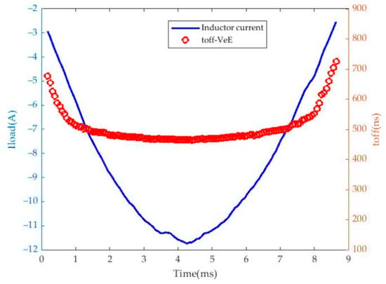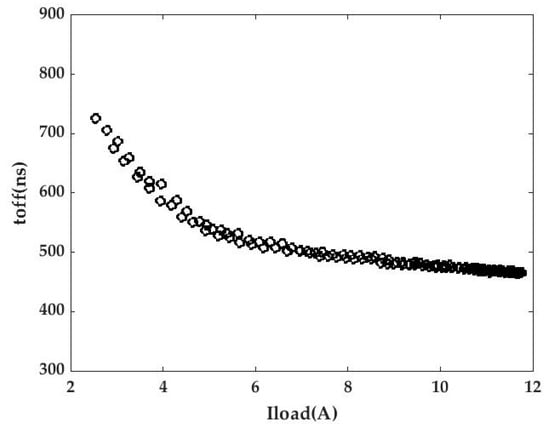In the negative half-cycle of the load current, the turn-off current of IGBT4 is determined by the magnitude of the load current. In other words, changes in the load current will result in changes in the turn-off current of IGBT4. From Figure 8, it can be inferred that the turn-off time will decrease as the turn-off current increases, and the decreasing trend of the turn-off time becomes slower and slower. This can also be observed from Figure 14, where the decreasing trend of the turn-off time becomes flatter as the load current approaches the maximum value in the reverse direction. Therefore, the relationship between the turn-off current (i.e., load current) and turn-off time of IGBT4 is plotted in Figure 16.