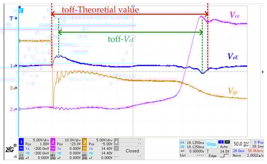As it is not possible to directly measure the collector current of the IGBT in practical inverters, it is assumed in this study that the turn-off process of the IGBT can be considered complete when the collector–emitter voltage Vce drops from its peak value to the bus voltage Vdc. Therefore, the actual turn-off time of the IGBT can be obtained through the gate voltage Vge and collector–emitter voltage Vce. For this purpose, waveforms of the gate voltage Vge and collector–emitter voltage Vce during the turn-off process of IGBT4 were also simultaneously recorded to determine the actual turn-off time of IGBT4 (Figure 17).