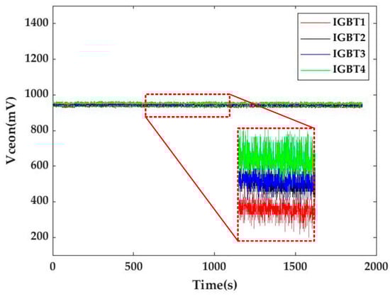 The single-phase reactive power inverter with a water-cooling machine was set to a temperature of 22 °C, a DC bus voltage of 400 V and a load current of 85 A. It was observed that, during a 1900s operation period, the on-state voltage of the four IGBTs remained very stable throughout the entire process with almost no fluctuations, except for a fixed bias caused by uneven heat dissipation that affected the on-state voltage of the four IGBTs.
