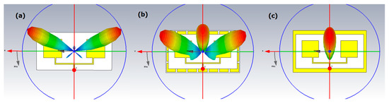 The distance between the antenna–copper and antenna–EBG is the same. As can be seen from the figure, in the PEC simulation, the pattern is concentrated in a single lobe, and in the PMC simulation, the pattern is divided into three parts.