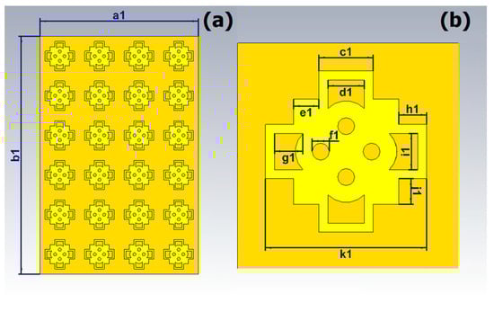 The proposed unit cell was designed with the changes made in the continuation of the study, resulting the response given in Figure 5b,c [35,36].