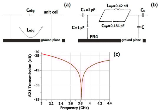 Equivalent circuit diagram of EBG unit cell (a) [18], the approximate equivalent circuit diagram of the proposed surface (b), tangential surface wave transmission behavior derived from the equivalent circuit of the proposed surface (c).
