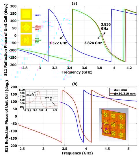 Thus, the second step is to design a unit cell so that its chosen frequency, in which the reflection phase angle of the surface is adjusted to 0°, is smaller than the operating frequencies of the top antenna to ensure that the starting frequencies are away from the zero-degree reflection region. Hence, the designed surface provides a reflection phase response of −170.47° and −176.77° at a half-wave distance to the feed, at the operating frequencies of the top antenna, 4.088 GHz and 4.116 GHz, respectively. In order to ensure the starting top antenna frequencies to be very close to the end of the response graph, gaps were opened on the unit cell and the phase response graph was slightly shifted to the left (see Figure 6). With the proposed solution, the need to change the unit cell and initial antenna dimensions is eliminated. Reducing the size of the top antenna and increasing the starting frequencies could be another solution here, but it would cause the antenna gain to decrease.