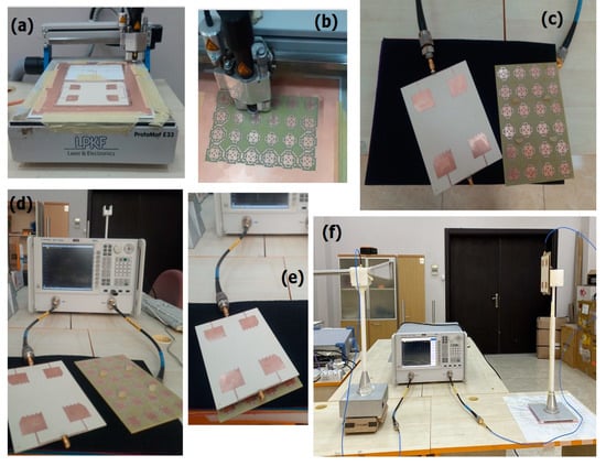 Manufacturing of the antenna (a), and the reflective surface (b) by engraving. Top view of the whole structure (c). Measurement of the antenna without the reflector (d), and with the reflector (e). Pattern measurement setup (f).