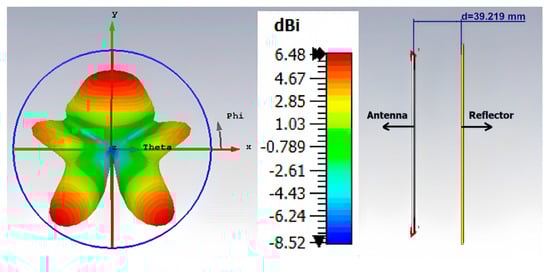 The radiation pattern with its directivity scale, while the distance between the antenna and the reflective surface is 39.219 mm. The distance between the antenna and the surface is given with d.