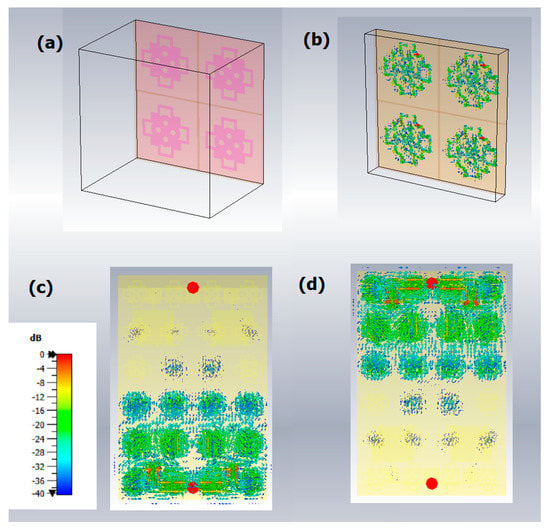 In Figure 9a, the distance between the unit cell and the feed is 39.219 mm, which is the half wavelength of the reflector’s 0° phase resonance frequency, while in Figure 9b, the distance is 6 mm. In Figure 9a, the surface current is negligible due to surface wave suppression. With the last distance of 6 mm between the unit cell and the feed as seen in Figure 9b, surface currents at 4.3 GHz are also observed since the surface impedance is lower. Figure 9c,d show the surface currents that occur when the whole structure is in operation. This figure is also another indication of the good isolation of the MIMO antenna.