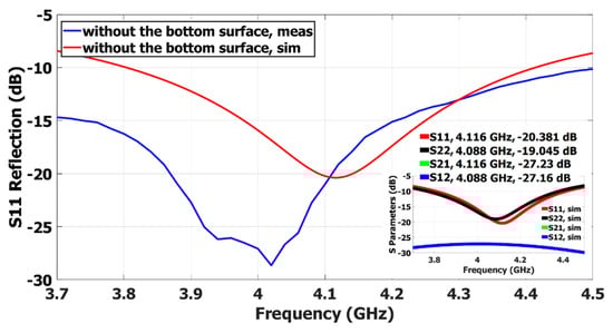 In Figure 10, S11 simulation and measurement results are compared when there is no reflective surface under the antenna. According to the measurement results, the antenna of the first port of this structure resonates at a frequency of 4.02 GHz with a −28.645 dB S11 value. The simulation result of the same port occurs at 4.116 GHz with its S11 value as −20.381 dB, as stated earlier.