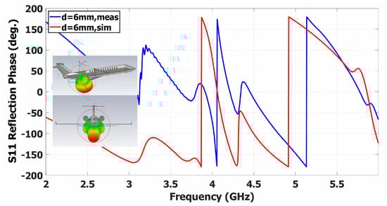 In Figure 11, the S11 simulation and measurement phase results of the whole structure are given. There is a gap of 6 mm between the antenna and the surface, while the simulation and measurement results of the S11 phase angle are drawn together.