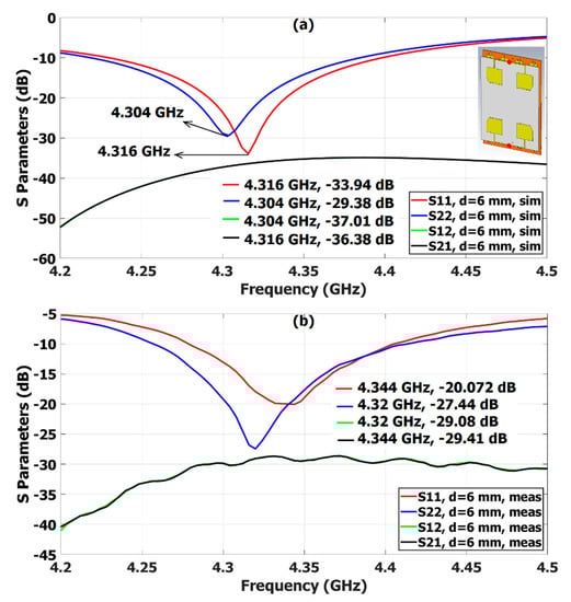 The S parameter results obtained from the measurements of the whole structure are collected in Figure 12. According to the S11 and S22 reflection measurement results of the antenna and the surface, which are on top of each other with a 6 mm gap as seen in Figure 12, the antenna connected to port 1 has a −20.072 dB value at 4.344 GHz, and the antenna connected to port 2 has a −27.44 dB at 4.32 GHz.