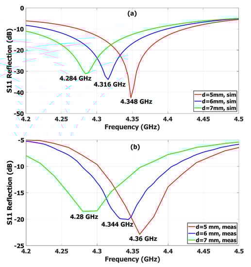 Considering the limits of the frequency band restricted with a −10 dB reflection value, the measurement bandwidth seems suitable for the 4.2 GHz–4.4 GHz band region applicable to the radio altimeter. In Figure 13, the simulation values of S11 are compared with respect to the distance between the antenna and the surface varying as 5 mm, 6 mm, and 7 mm. The operating frequencies are 4.348 GHz, 4.316 GHz, and 4.284 GHz, respectively. It is seen that the operating frequency decreases as the distance increases. Similarly, for these distances, the operating frequencies are 4.36 GHz, 4.344 GHz, and 4.28 GHz in the measurement (see Figure 13). S11 values are measured as −22.87 dB, −20.072 dB, and −18.53 dB, in the same frequency order.