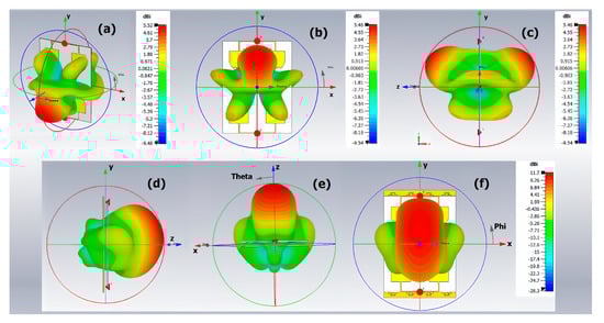 Simulation pattern without a reflector on the scale of directivity. Perspective view (a) with the operating frequency of f = 4.088 GHz while port 2 is fed, front view (b) and side view (c) with the operating frequency of f = 4.116 GHz while port 1 is fed. Side view (d), front view (e), and top view (f) of the antenna pattern simulated with the reflector on the scale of directivity while port 1 is fed.