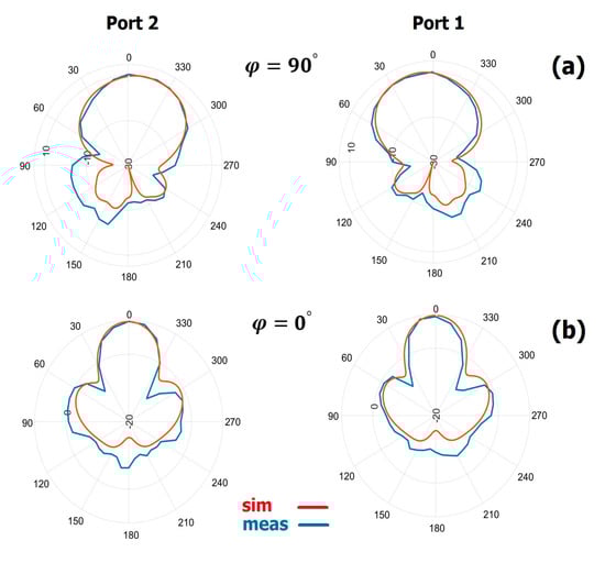 The measurement studies were conducted at 4.344 GHz for port 1 and 4.32 GHz for port 2. Note that the opposing antennas act like a director to each other and affect the propagation angle. The radiation properties of the antennas are gathered in Table 3 and Table 4 according to φ = 90° cut angle. The radio altimeter features were obtained at φ = 90°, hence the antenna was evaluated in this aspect. This is the same as turning the antenna φ = 90° while viewing it from the perspective of φ = 0°. The simulated value of −19.1 dB side lobe level (SLL) is noteworthy and evidence of the successful focus of power, as intended, although the least measured result of −12.6057 dB appears to have been due to the laboratory conditions. Another result to pay attention to is angular width. The recommended width for the radio altimeter is between 35° and 60°, and the proposed antenna creates a half-power beamwidth (HPBW) very close to this value. The measured HPBW values are 60° and 70°. As the measurements are performed at every 10°, the coding performed by the authors caught these values. It can easily be seen that if the measurement angle hops were narrower, the code would also have caught an HPBW value close to 60° for port 1. According to simulation results, the gain increases from 5.34 dBi to 10.3 dBi for port 1 when the reflective surface is placed under these antennas. The measurements support this case with a measured gain of 10.1497 dBi achieved for port 1. There is a similar result for the other port. The measured gain can be evaluated as realized gain because it includes the losses. When the antenna operates without the reflector, its directivity is not very high due to having a pattern close to the omnidirectional pattern rather than directional, as was desired from the very beginning. This antenna has a minimum directivity of 5.46 dBi without the reflector. In our measurements, which were carried out with the surface at a distance of 6 mm, it is observed that the directivity value exceeded 11.5 dBi (see Table 4). The main purpose of the design with the reflective surface is clearly seen in these results. To obey the design criteria determined for the radio altimeter by ITU, the gain should be between 8 and 13 dBi [38].