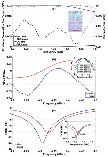 Diversity gain (DG) and envelope correlation coefficient (ECC) simulation and measurement results of the MIMO antenna with its reflector surface with the representation of the surface current while one port of the antenna is fed (a). Mean effective gain (b). Total active reflection coefficient (c).