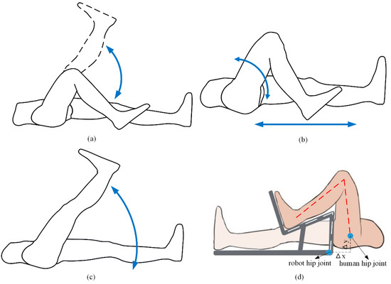 The multiple rehabilitation exercises recommended by therapists. (a) Knee flexion and extension with the hip fixed. (b) Knee flexion and extension. (c) Elevation–depression of the extended leg. (d) Misalignments between CPM device joints and the human joints.