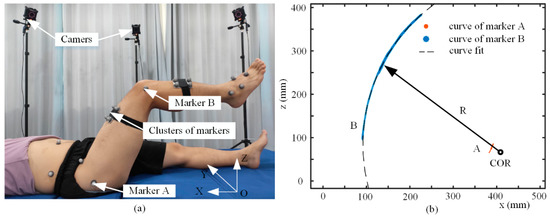 Acquisition of the trajectory data of the thigh. COR: center of rotation. (a) Motion capture system and location of markers on the leg. (b) Trajectories of the markers of A and B.