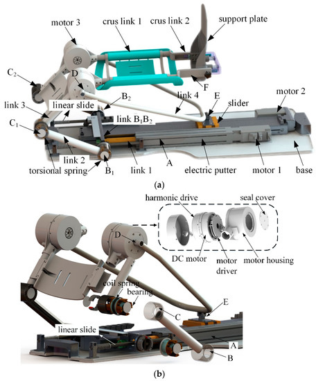 Details of the virtual prototype of the proposed robot are depicted in Figure 3. The robot consists of three modules, namely, hip, knee, and ankle joint mechanisms. In this study, to endow the LLRR with good compatible performance while ensuring small size and low inertia, an underactuated five-bar linkage based on a double slider-crank mechanism was developed. Moreover, the affordability of LLRR for outpatient and home settings is another objective of this novel design. The proposed robot is mainly made of aluminum alloy pipes and plastic, to reduce the weight. Figure 3b shows the exploded view for the underactuated mechanism, especially the joint unit B, C and D. Joint B and C has the same mechanical components, consisting of bearing and customized spring units. It should be pointed out that link 4 is connected with link 3 through a passive revolute on the seal cover of the motor housing. The electric putter is comprised of a high-performance 24 V step motor (AZM46MK, Oriental motor, Tokyo, Japan), a gearbox with a 100:1 reduction ratio, and an electric cylinder with a stroke of 30 mm. The actuation units of motors 1 and 2 are the same, while the stroke of slider E is 70 mm. The motor of joint D does not belong to the underactuated mechanism, indicating that the actuation units of the underactuated mechanism only include motors 1 and 2.