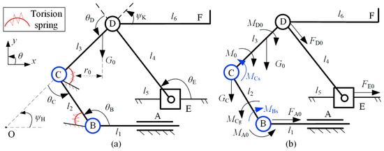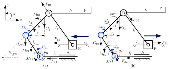 The gravity of a lower limb restricts the movement of the five-bar linkage when the leg is attached to links l3 and l6. The movement trajectory of the thigh (see Figure 2) forms a constraint on the movement of link l3, which is referred to as an external constraint. The forces exerted by joints E and A, spring torsion, gravity, and external constraint work together to keep the five-bar linkage in a required configuration. The torque MD generated by the actuation force FE is applied to link l3 via link l4, as shown in Figure 5. Similarly, torque MA generated by the actuation force FA is applied to link l2. For a better understanding of the motion principle of the five-bar linkage, a quasi-static equilibrium about joints B and C is obtained, as shown in Figure 5.