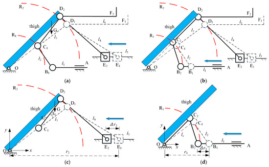 Figure 6a,b illustrate the motion principle of the hip joint mechanism (underactuated five-bar linkage). It should be noted that this sequence occurs while the actuators continuously move to the left. In Figure 6a, link l3 on joint D is rotated counterclockwise as the actuated joint E moves from the initial position E1 to E2, and joint C acts as a rotating base. When the thigh is strapped to link l3 through belts, the hip joint O acts as a virtual base. Thus, the proposed five-bar mechanism can be considered as a series of two consecutive three-bar slider-crank linkage mechanisms EDO and BCO, as shown in Figure 6c,d. Figure 6c shows that the distance r2 decreases along the x-axis as the actuated joint E moves by a small displacement ∆r2 (leftward movement), inducing a small angular displacement (∆2) between the thigh and l3. Therefore, the thigh gravity exerted on joint C will decrease considerably. Due to the effect of MBs, joint C will be stuck by the thigh when the passively driven joint B shifts to the left by a small displacement ∆r1 (leftward movement), as shown in Figure 6d. Joints C and D can fit a circular trajectory by changing the pose of the link CD through the special sequence motion of joints E and A. Therefore, the position of the virtual base point O can be changed to adapt the mechanism to different thigh lengths. Various parameters such as the pose of link CD and the values of θB and θC can be obtained by the inertial sensor and potentiometer. These parameters enable the system to achieve closed-loop control and adjust the pose of link CD by adjusting the displacement of joints E and B. Finally, the estimation of kinematic compatibility [24,42] for the hip joint mechanism can be obtained by collecting misalignment between the thigh and link CD. For these reasons, the proposed five-bar linkage mechanism has the characteristics of the RCM mechanism, low inertia and underactuation, which can also adapt to patients with different heights.