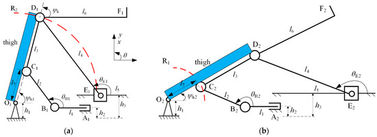 The limit positions of the hip joint mechanism are shown in Figure 7, and virtual joint O corresponds to the hip joint. Due to the limitation of the robot base and range of θB, the minimum value of the hip joint is 20° (ΨH2 = 20°). Considering the 50th percentile of sitting thigh thickness parameters [43] and design convenience, the height of the virtual rotation center is set to 60 mm (h1). The height of the center of joint B is designed as h2 = 40 mm, and the height of joint E is h3 = 80 mm. The value of l4 can be determined according to Equations (12) and (13), while the maximum value of l1 can be determined according to the vector-loop equation obtained from Figure 7a, as follows: