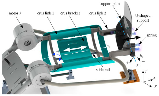 The knee and ankle joint mechanism model composed of crus link 1 and crus link 2 is shown in Figure 8. The length of connecting link 2 can be adjusted to different calf lengths. Motor module 3 consists of a DC servo motor and a harmonic reducer. This motor module directly drives crus link 1 to complete the rotation of the knee joint mechanism. The knee joint mechanism could induce a slight movement of the sagittal plane and tibia rotation accompanied by skin deformations [19,44]. These deformations occurring at the interface between the leg and the robot might cause uncontrollable forces. Therefore, passive mechanisms were added to the crus bracket and support plate to avoid the appearance of undesired forces [45].
