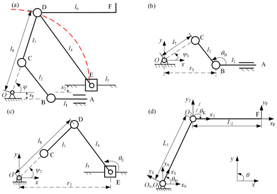 Schematic structure of the robot and two three-bar slider-crank movements. (a) Parameters of the proposed robot. (b,c) Parameters of the equivalent slider-crank BCO and EDO, respectively. (d) Kinematic parametric model of the equivalent two-link mechanism.
