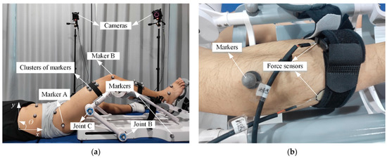 Experimental setup during testing of the robot. (a) Performance tests for the arthro-kinematic compatibility, markers were placed on subjects and the robot. (b) Force-measuring sensors were placed on the shank.