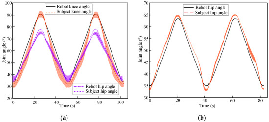 Average results of the joint angles in different passive rehabilitation exercises. (a) Knee and hip joint angles in passive knee flexion–extension exercise. (b) Hip joint angles in passive elevation of the extended leg exercise. Shaded areas indicate ±1 SD.