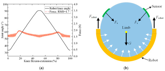 The natural motion trajectories (without the robot) of three healthy subjects were recorded as reference using the motion capture system and map the reference trajectory to the joint space of the robot. In these tests, the subject joint angles are measured using the motion capture system. The corresponding joints angular of the robot are recorded by the motion capture system and potentiometer assembled in the robotic joint together, as shown in Figure 10a. To measure the human–robot interaction forces, two Flexiforce A301 sensors (Tekscan Inc., Norwood, MA, USA) are placed between a soft elastic strap of the robot and the human shank, as shown in Figure 10b. Considering that pressure measurements during the passive exercise are susceptible to being influenced by the initial preload of the fastening strap, the total initial preload measured by the sensors is set as roughly 1.5 N. The preload of the elastic strap was below the comfort limit of each subject. In this paper, we processed data and exported the results using Micro Cal Origin 2017 software.