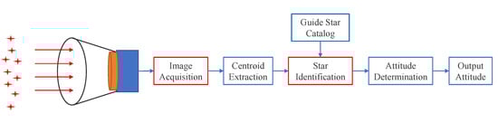In the CSST, the FGS is needed to provide accurate pointing information for the telescope. The flowchart shown in Figure 1 includes the image acquisition, centroid extraction, star identification, and attitude determination. Image acquisition and star identification were the main focuses of this work.