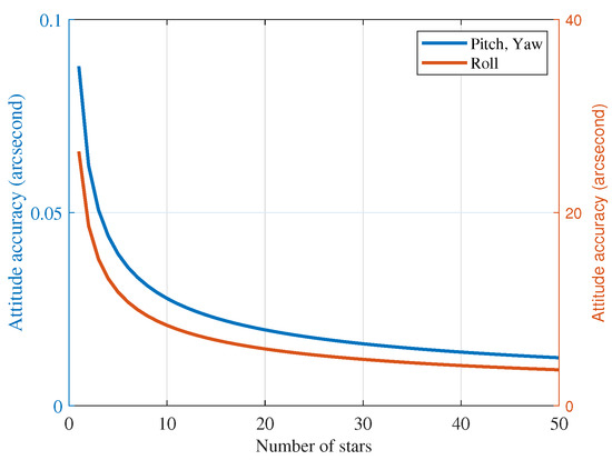 When , , and , the relationship between the NOS in the FOV and the attitude accuracy is shown in Figure 2. The roll accuracy is less accurate than the pitch/yaw accuracy. The reason for this is that the dimensions of the focal length are larger than the focal plane itself [37]. From the figure, it can be seen that with more stars included in the calculation, the attitude accuracy of the FGS is higher, but more hardware resources will be consumed in star identification and attitude determination. Therefore, it is necessary to analyze the relationship between the exposure time of the detector and the NOS and adjust the exposure time to keep the NOS at the target number that satisfies the attitude accuracy.