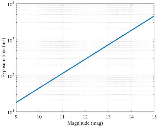 When mm, , , nm, and the magnitude range is 9–15, the exposure time corresponding to the 95% full-well DN value of the stars in the magnitude range is shown in Figure 3. From the figure, it can be concluded that as the exposure time increases, the stars of low magnitude will gradually become saturated.