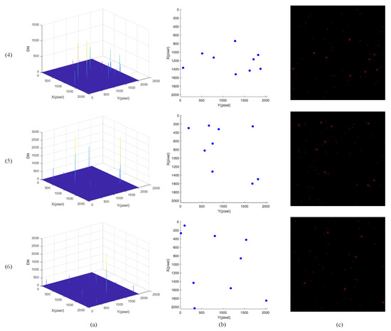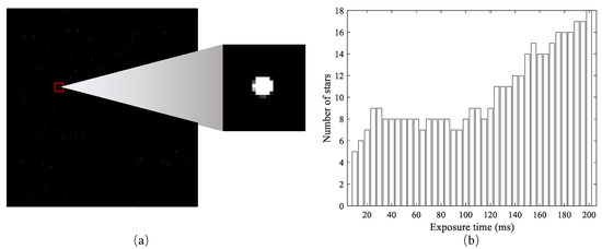 It was assumed that the FOV of the FGS is ; the detector size is ; the LOS direction is declination, right ascension; and the magnitude range is 9–15. The range of the right ascension and declination corresponding to the FOV in the celestial coordinate system was calculated. The stars of 9–15 mag in this range were obtained from the GaiaDR2 star catalog, and the position coordinates of the stars in the celestial coordinate system were converted to focal-plane coordinates through the rotation transformation matrix and underwent perspective projection transformation from the celestial coordinate system to the FGS coordinate system. Moreover, the position of the stars on the focal plane was obtained. Then, according to Equations (3) and (9), the gray distribution of the star points on the focal plane was calculated, and a simulated star map, as shown in Figure 4a, was obtained. In this FOV, the NOS detected in the FOV was calculated by adjusting the exposure time, and the result is shown in Figure 4b. As the exposure time increased, the NOS detected in the FOV increased.