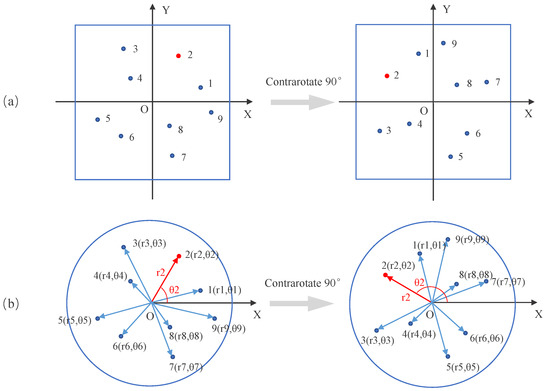 Changes in the star map before and after rotation in different coordinate systems. (a) The plane Cartesian coordinates. (b) The polar coordinate system.