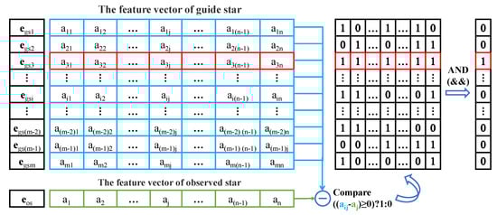 Figure 8 shows a demonstration diagram of the comparison-AND matching strategy. The feature vector of the guide star in the FOV is an × matrix, and the feature vector of the observing star is a 1 × matrix. The following is the matching strategy: