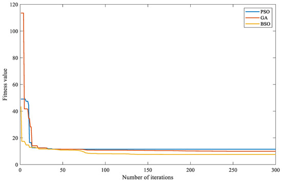 The performance of the optimization algorithm was evaluated by the final convergence value of the objective function. The fitting results of the BSO algorithm, the particle swarm optimization algorithm (PSO), and the genetic algorithm (GA) were compared, as were the convergence curves of each algorithm, as shown in Figure 10.
